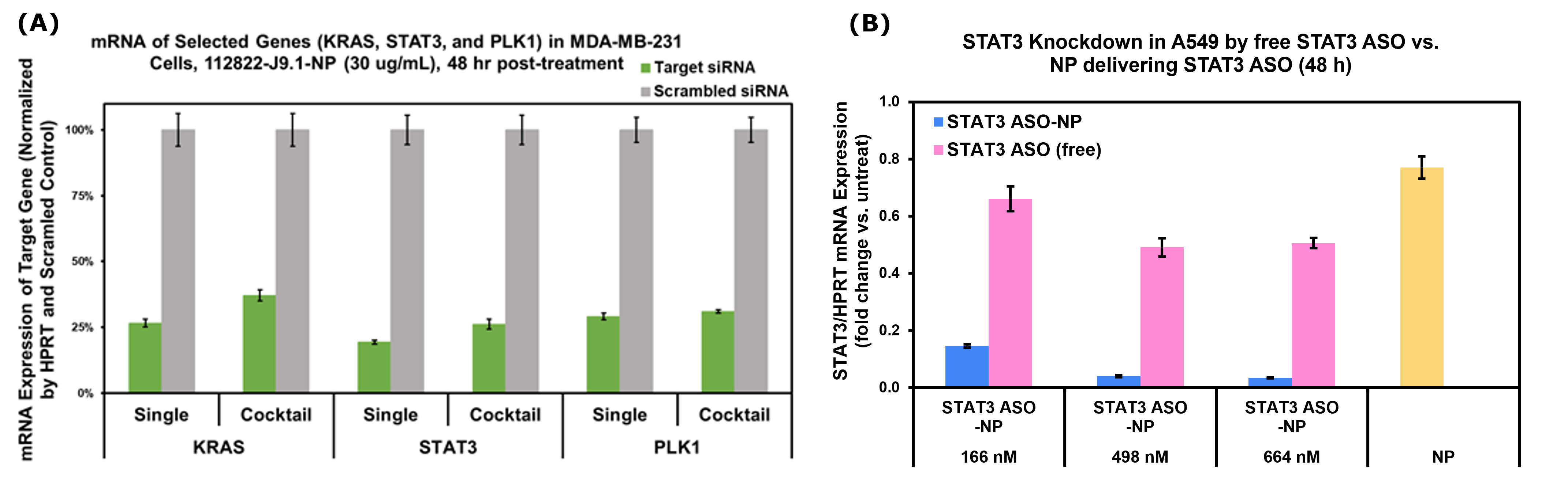 For targets that are not druggable with conventional drugs, Pdx-NPTM can deliver a cocktail of 3 siRNAs to inhibit 3 genes at once (Fig. A) or antisense (ASO) 10-fold more effectively than free ASO counterpart (Fig. B).